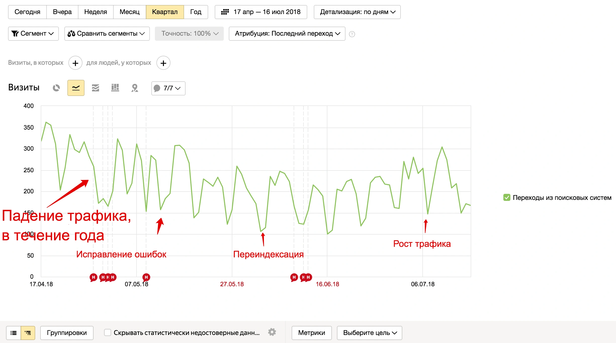 Было выявлено более 114 факторов негативно влияющих на позиции сайта и соответственно трафик. На данный момент 16.07.2018 исправлено около 30% уже наблюдается рост трафика и видимости сайта. Работы по проекту продолжаются.